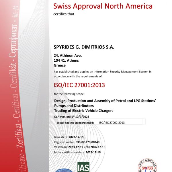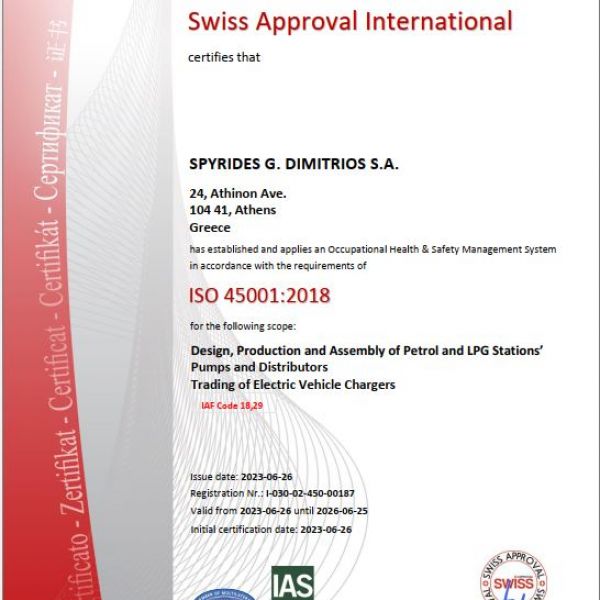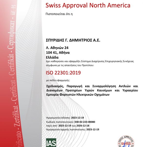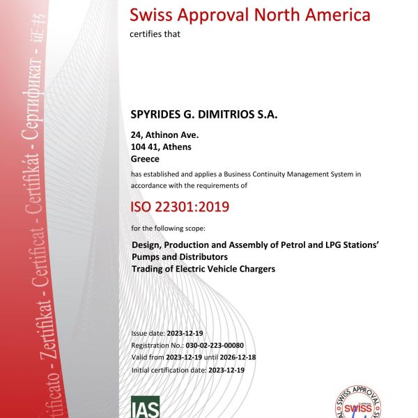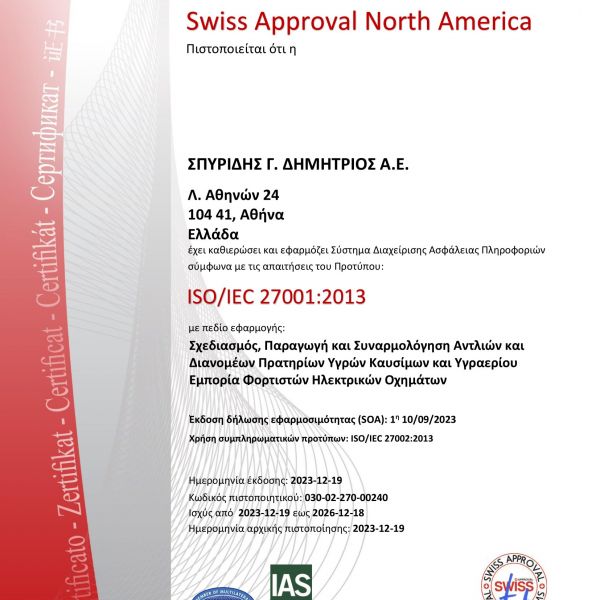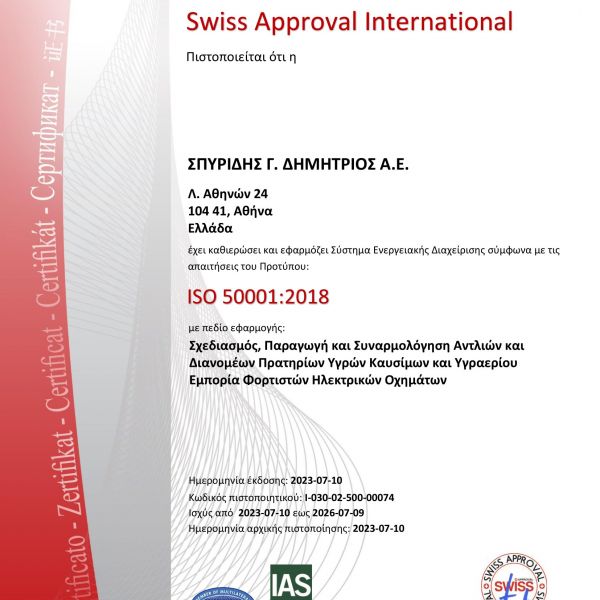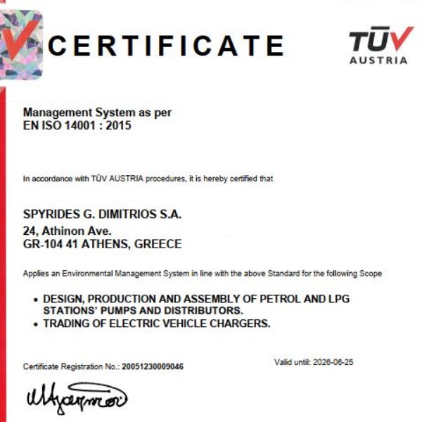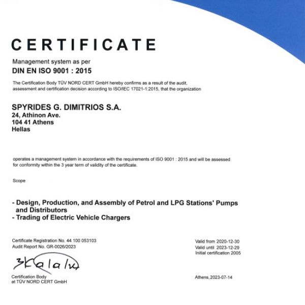 Η Εταιρία ΣΠΥΡΙΔΗΣ Α.Ε. εφαρμόζει εγκεκριμένο σύστημα ποιότητας για την παραγωγή, τελική επιθεώρηση και δοκιμές των αντλιών πρατηρίων υγρών καυσίμων και υπόκειται στην επιτήρηση υπό την ευθύνη Ευρωπαϊκού κοινοποιημένου φορέα με σκοπό τη διασφάλιση ότι η Εταιρία πληροί ορθά τις υποχρεώσεις οι οποίες προκύπτουν από το εγκεκριμένο σύστημα διαχείρισης ποιότητας ISO9001:2015.