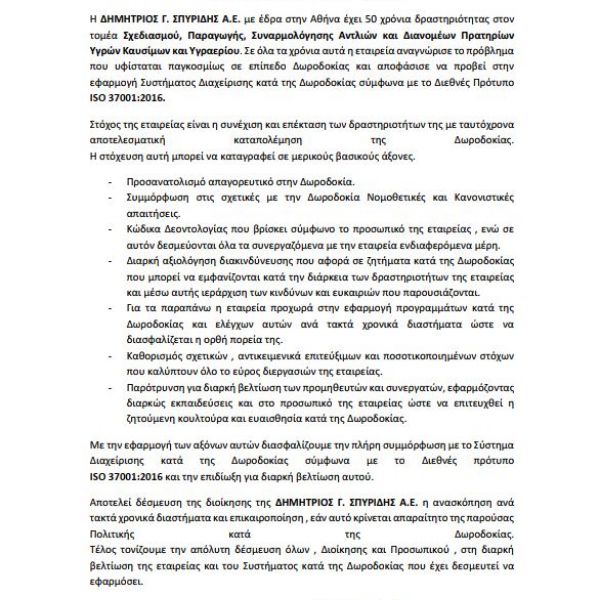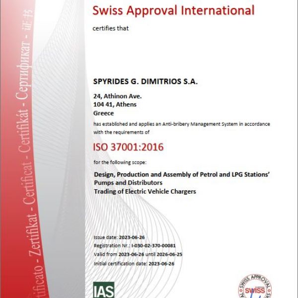 Πρόσφατα, η εταιρία μας πιστοποιήθηκε τόσο κατά EN ISO 14001:2015 (Σύστημα Περιβαλλοντικής Διαχείρισης), όσο και κατά EN ISO 37001:2016 (Σύστημα κατά της Διαφθοράς).